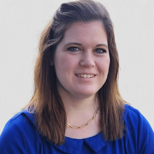 A woman with straight brown hair wearing a blue top and a gold necklace smiles at the camera in front of a plain, light background.